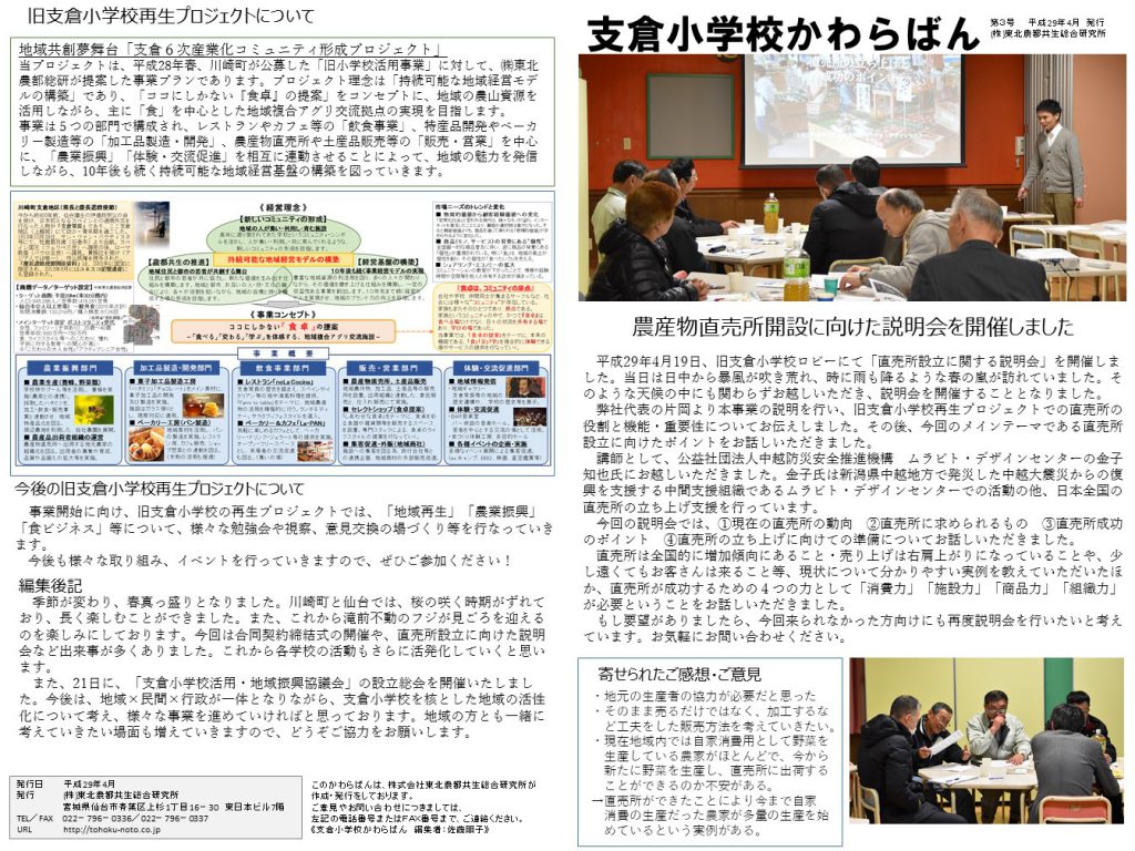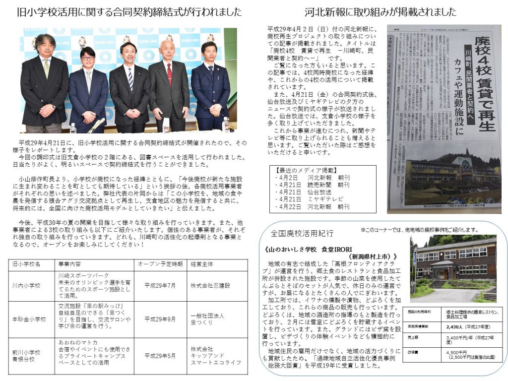 先日開催された、「直売所開設に向けた説明会」及び、「旧小学校活用事業に関する合同契約締結式」等の内容をまとめたかわらばんを発行しました。