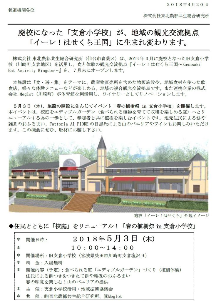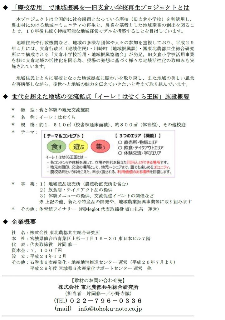 株式会社 東北農都共生総合研究所(仙台市青葉区)は、2012年3月に廃校となった